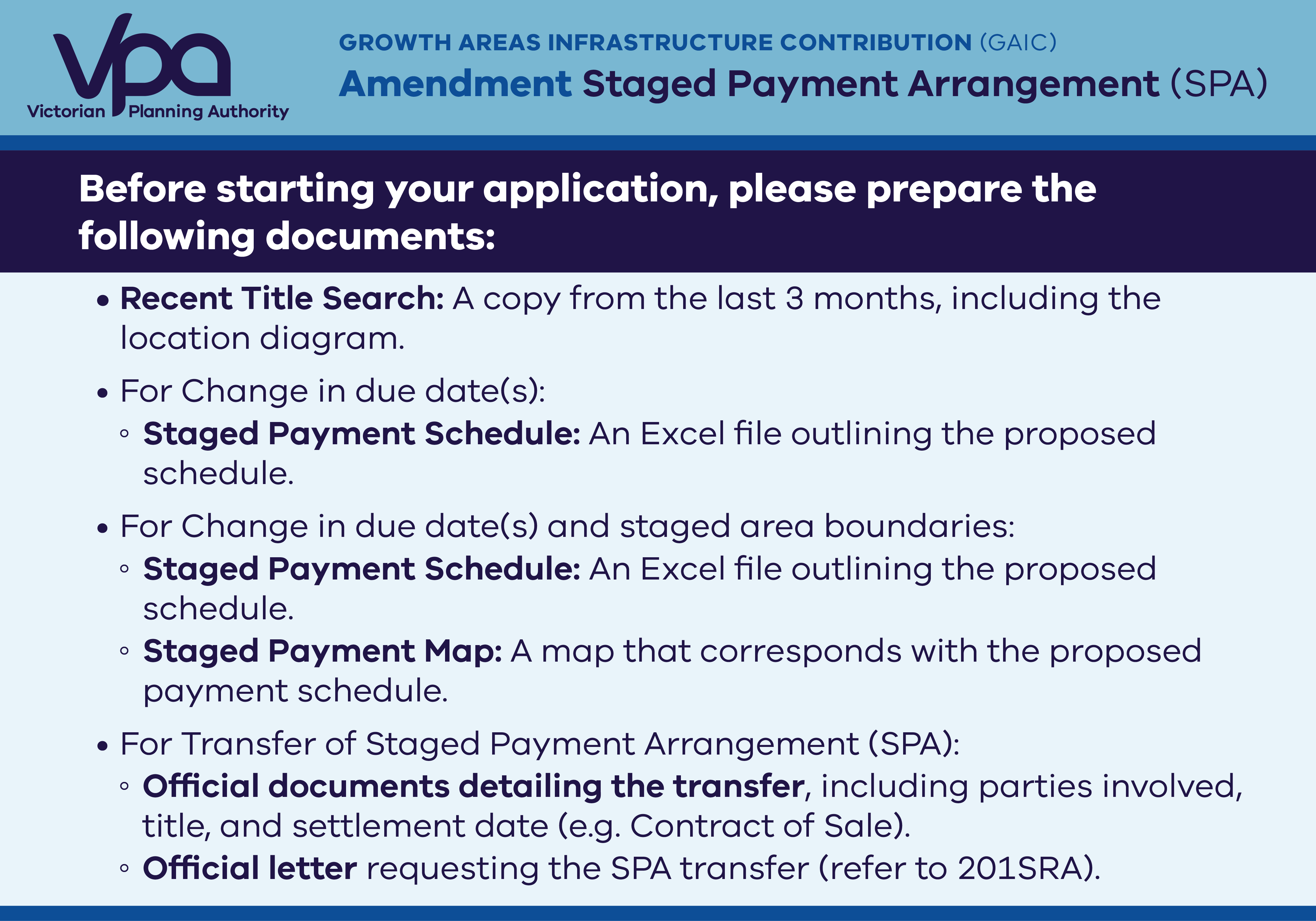 GAIC Updated Forms – Amendment Only For information on Privacy, refer to the Privacy Statement. Please refer to the Growth Areas Infrastructure Contribution (GAIC) – Staged Payment Arrangement Guidelines – January 2023 (PDF) prior to completing this form. It is an offence to make a false or misleading statement. Amendment Application GAIC - AMENDMENT STAGED PAYMENT ARRANGEMENT (SPA) GAIC - AMENDMENT STAGED PAYMENT ARRANGEMENT (SPA) What is the current SPA reference number? * SECTION A -1. CONTACT DETAILS (FOR QUERIES) arrowup6 For VPA to request additional information and for final approved SPA notice to be emailed. Full name of Contact * Company the Contact works for * Employment Position/Title of Contact Contact Number * Secondary Contact Number Email * A - 2. CONTACT DETAILS (FOR SPA NOTICE) arrowup6 Secondary contact if required. Full name of Contact Company the Contact works for Employment Position/Title of Contact Contact Number Secondary Contact Number Email SECTION B - OWNER AND PROPERTY DETALS arrowup6 Address of Land * Property Owner(s) * Notice of Approval - Current SPA * Drop a file here or click to upload Upload the current SPA Maximum file size: 30MB SECTION C - AMENDMENT DETAILS arrowup6 Required Changes * Payment Due Date Only Other (e.g. change of due dates and change of staging plans) Transfer of SPA - P&E Act s.201SRA Please attach the applicable documents. Summary of Changes * Proposed Schedule * Drop a file here or click to upload Choose File Maximum file size: 30MB Upload the updated schedule (Excel format). Clearly indicate paid stages as 'paid'. Revised Staging Map * Choose File Maximum file size: 30MB The estate stage description and area must match with the ones in the proposed schedule Transfer of SPA - P&E Act s.201SRA * Choose File Maximum file size: 30MB Legal documents showing the title, vendor and purchaser. e.g. contract of sales (excerpts) Transfer of SPA - P&E Act s.201SRA * Choose File Maximum file size: 30MB Official Letter requests a SPA transfer. include the purchaser's contact details. If both parties are represented by a firm, one letter is sufficient. Date * Fill in the expected settlement date SECTION D - CERTIFICATION arrowup6 This section may be signed by the owner or the person who has a written authority to act on behalf of the owner(s) in relation to the application. Signature * Clear Name of Signatory * Date * Note (If required) Add any notes that support the application. Additional documents (If required) Drop a file here or click to upload Choose File Maximum file size: 31.46MB Upload any documents that support the application. Submit Save now to complete later If you are human, leave this field blank.