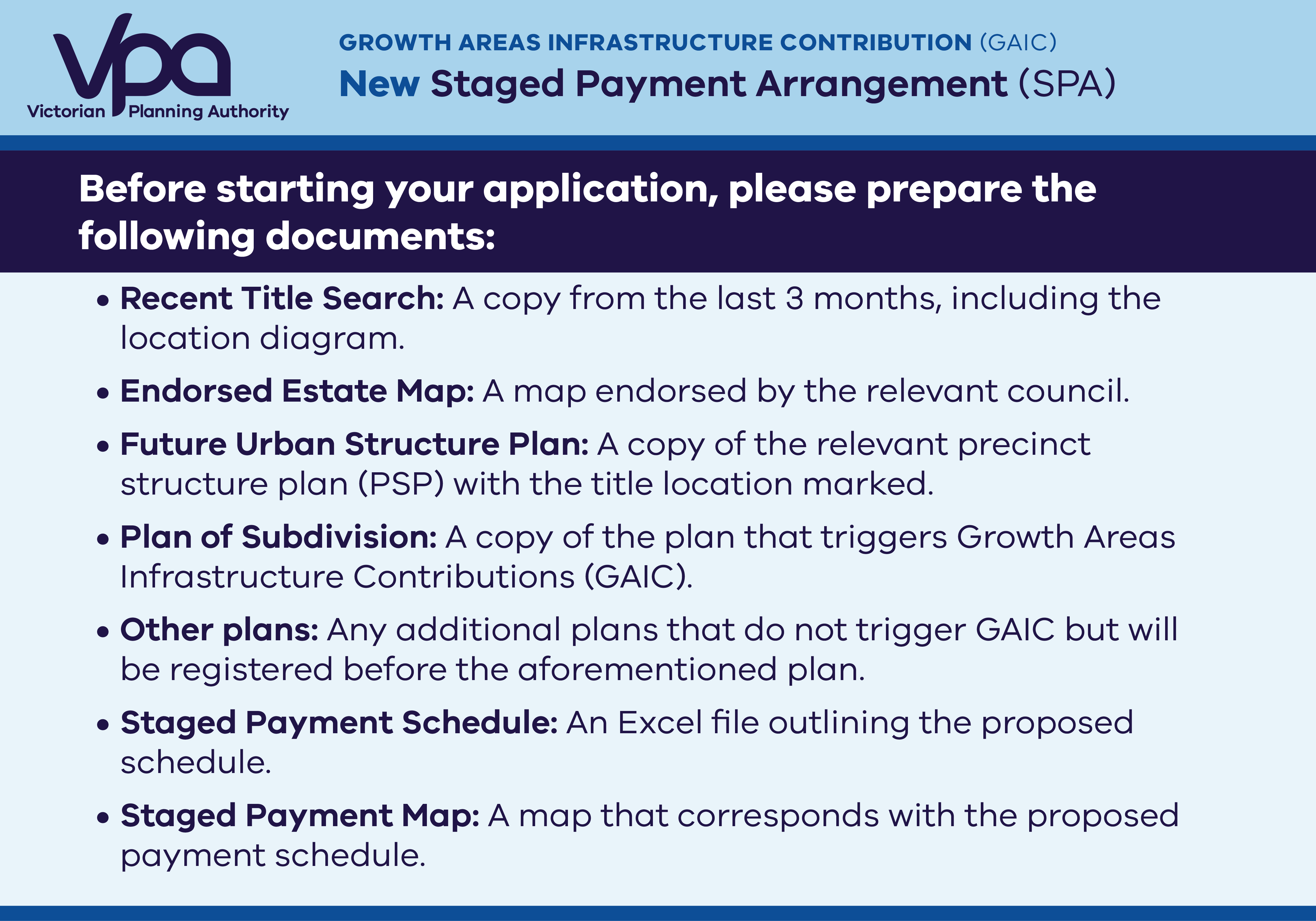 GAIC Updated Forms – New Application For information on Privacy, refer to the Privacy Statement. Please refer to the Growth Areas Infrastructure Contribution (GAIC) – Staged Payment Arrangement Guidelines – January 2023 (PDF) prior to completing this form. It is an offence to make a false or misleading statement. GAIC - NEW STAGED PAYMENT ARRANGMENT (SPA) GAIC - NEW STAGED PAYMENT ARRANGMENT (SPA) SECTION A - 1. CONTACT DETAILS (FOR QUERIES) arrowup6 For VPA to request more information or ask queries regarding the application. Full name of Contact * Company the Contact works for * Employment Position/Title of Contact Contact Number * Secondary Contact Number Email * A - 2. SECONDARY CONTACT DETAILS (FOR NOTICE OF SPA) arrowup6 An approved notice of SPA will be emailed to this Contact. Full name of Contact * Company the Contact works for * Employment Position/Title of Contact Contact Number Secondary Contact Number Email * SECTION B - OWNER AND PROPERTY DETAILS arrowup6 Property which GAIC is to be paid and Staged Payment Arrangement is sought for. Address of Land * Owner(s) * Volume * Folio * SPI - Lot * SPI - Plan Number * Registered Title Search issued within last 3 months. Must include a location diagram.. * Drop a file here or click to upload Choose File Maximum file size: 30MB SECTION C - DEVELOPMENT DETAILS arrowup6 Website link for the Estate Estate Map (endorsed by the Council) marking the title within * Drop a file here or click to upload Choose File Maximum file size: 30MB Overall development map for the relevant estate. Relevant PSP * Future Urban Structure Plan of the relevant PSP marking the title within * Drop a file here or click to upload Choose File Maximum file size: 30MB Developer * SECTION D - GAIC EVENT AND SUBDIVISION SEQUENCE DETAILS arrowup6 GAIC Event (Dutiable Transfer) * The title was transferred in the past The title was never transferred in the past GAIC Event Date (Dutiable Transfer) * The date when the parcel was first transferred. Certificate of Deferral * Drop a file here or click to upload Choose File Maximum file size: 31.46MB Upload a copy of the deferral certificate issued by the State Revenue Office when opted for deferral. GAIC Event (Subdivision or Building Permit) * A building permit application will be (was) submitted before subdividing the parcel A building permit application will not be (was not) submitted before subdividing the parcel GAIC Event - Building Permit Application * The date when the first building permit application (will be) submitted. Building Permit Application - Supporting Documents * Drop a file here or click to upload Choose File Maximum file size: 30MB Upload the documents that explain the development, including a location diagram. GAIC Event - Statement of Compliance (Subdivision) * The date when the first statement of compliance for the parcel was (will be) issued. Copy of Subdivision Plan - 1st Plan * Drop a file here or click to upload Choose File Maximum file size: 30MB 1st Plan - The plan that will trigger (triggered) GAIC. Copy of Subdivision Plan - Other Plans Drop a file here or click to upload Choose File Maximum file size: 30MB Related plans that will be registered before 1st Plan. e.g. s.35 plan, GAIC excluded subdivisions, consolidations. SECTION E - LIABILITY AND PROPOSED STAGED PAYMENT SCHEDULE arrowup6 Total Area (HA) - Rounded to 5 decimal points. The total area according to the survey result. * GAIC Area (HA) - Rounded to 5 decimal points. * Total Liability * Staging Map (SPA MAP) * Drop a file here or click to upload Choose File Maximum file size: 30MB The estate description and area in the SPA MAP should match with the ones in the proposed schedule. Proposed Schedule of Staged Payment * Drop a file here or click to upload Choose File Maximum file size: 30MB Upload the Excel spreadsheet (template shown below). SECTION F - CERTIFICATION arrowup6 This section may be signed by the owner or the person who has written authority to act on behalf of the owner(s) in relation to the application. Signature * Clear Name of Signatory * Date NOTE (If required) Add any notes that support the application. Additional documents (If required) Upload any documents that support the application Drop a file here or click to upload Choose File Maximum file size: 31.46MB Submit Save now to complete later If you are human, leave this field blank.