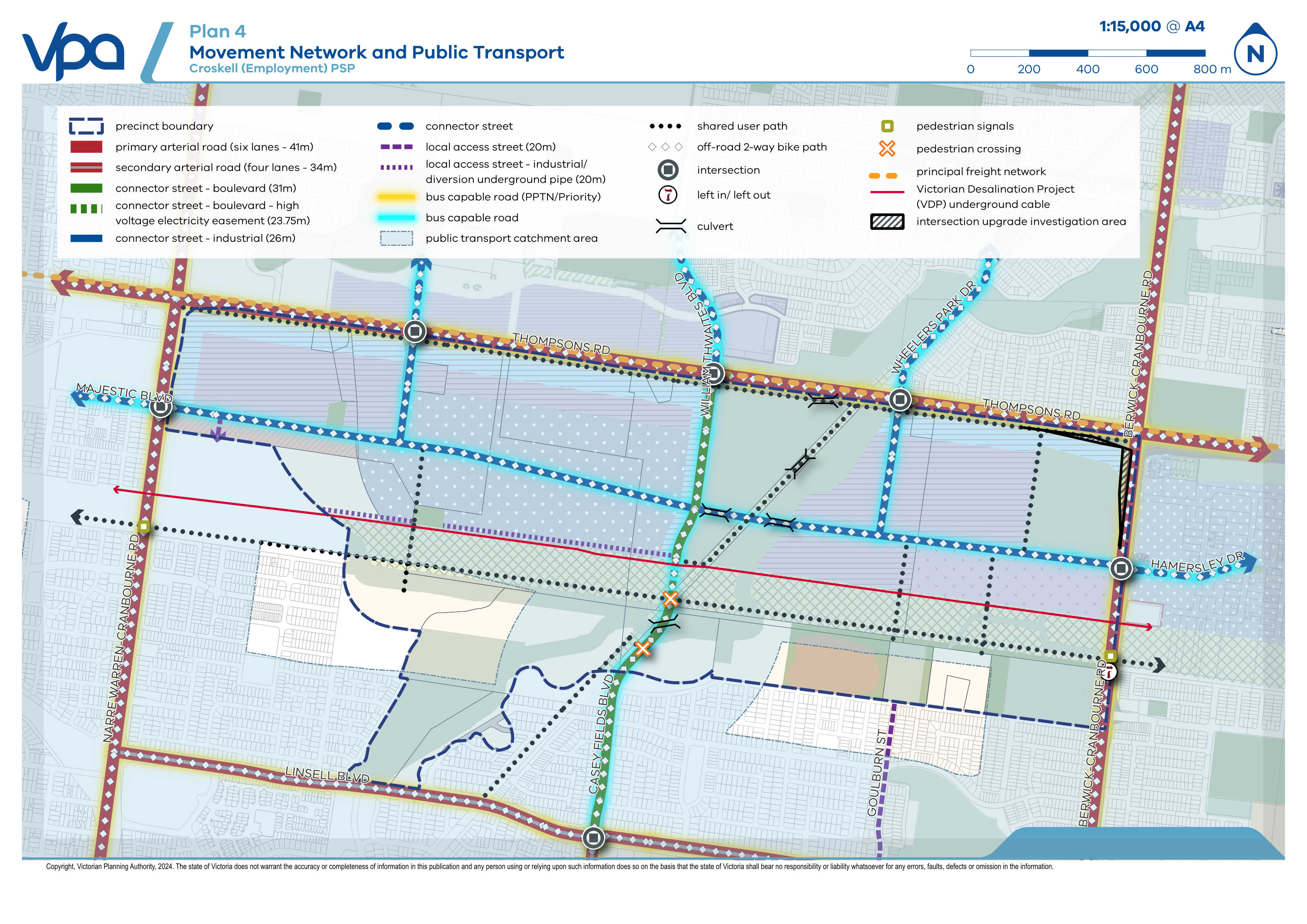 The predominantly rural landscape of the Croskell precinct will be urbanised with new homes, businesses and infrastructure. There will be new work opportunities for local residents, with upwards of 6,532 new jobs expected to be generated within the precinct. The precinct will also deliver new east-west and north-south transport connections, providing new road and shared user path alternatives to Thompsons Road, Linsell Boulevard, Berwick Cranbourne Road and Narre Warren Cranbourne Road.